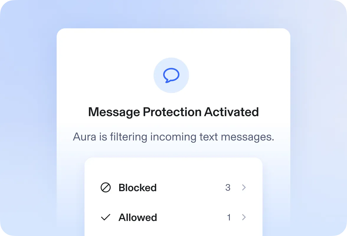 Aura protects you from harmful text messages by filtering out known spam numbers and scanning links in the message for phishing threats. Harmful messages will be placed in your junk folder.